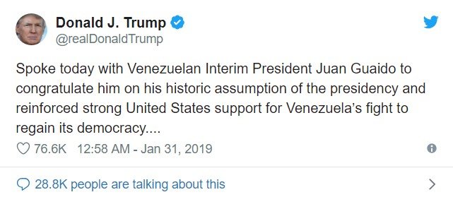 On January 30th, US President Donald Trump spoke with US-Proclaimed Venezuelan Interim President Juan Guaido, congratulating him on his “historic…