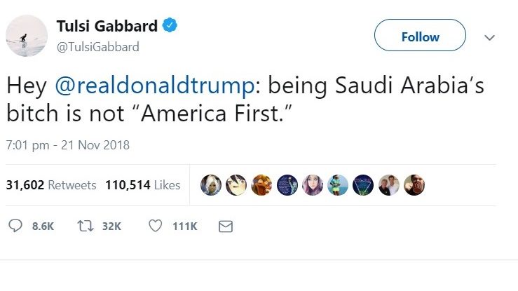 Congresswoman Tulsi Gabbard (D-Hawaii) has slammed US President Donald Trump’s commitment to defend Saudi Arabia in the Jamal Khashoggi case…
