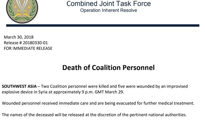 Two US-led coalition servicemembers have been killed and five others have been injured in an improvised explosive device (IED) explosion in…