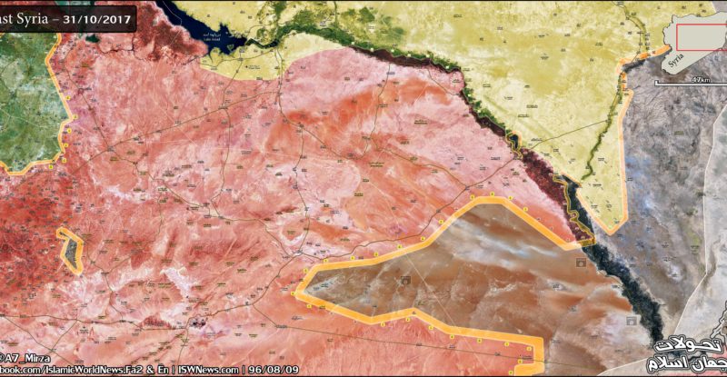 This map provides a general look at the military situation in Syria and Iraq on November 1, 2017. The Syrian…