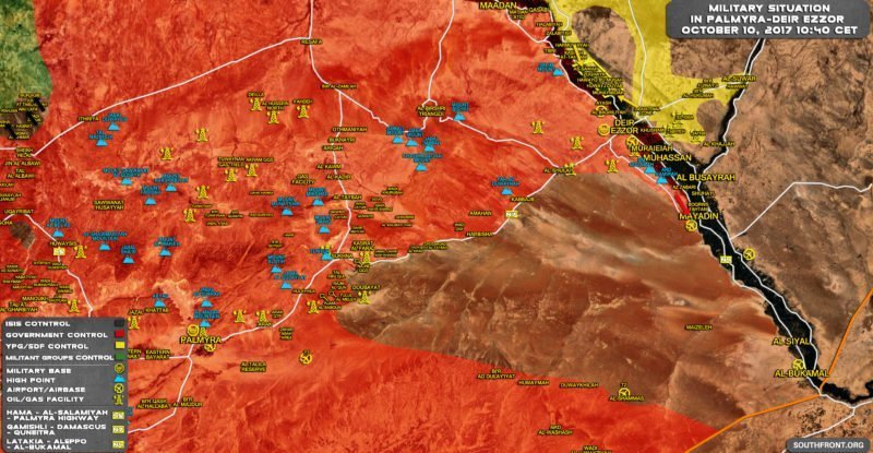 This map provides a general look at the military situation in central Syria on October 10, 2017. Syrian government forces…
