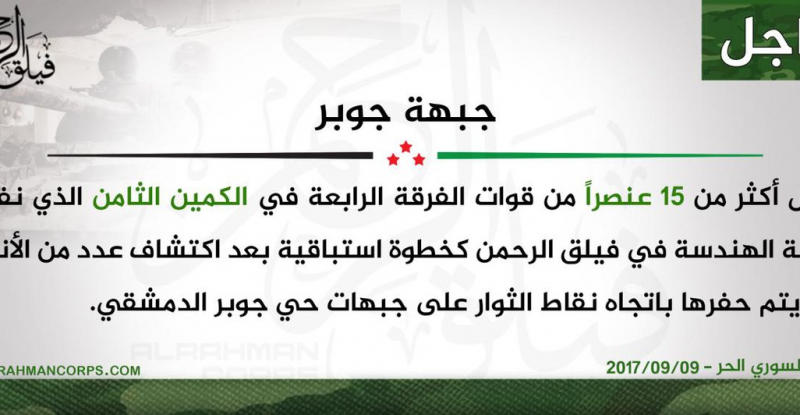 On September 9, heavy clashes and artillery duels erupted between the Syrian Arab Army (SAA) and Faylaq al-Rahman in Jobar…