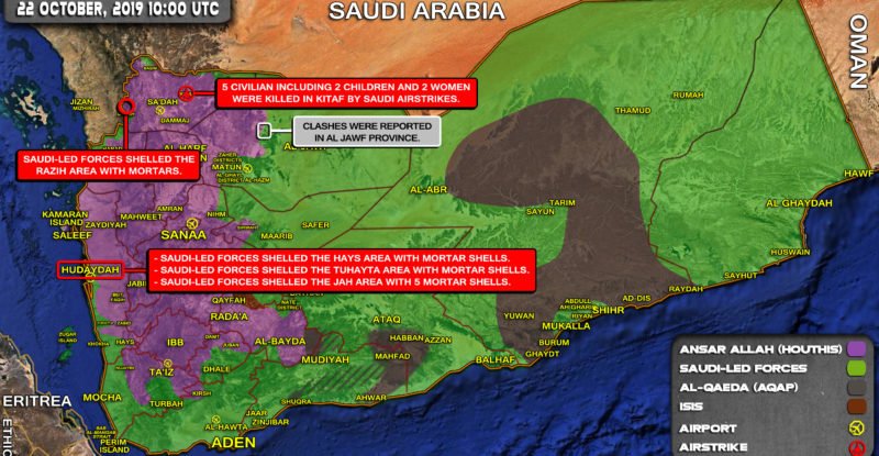 Clashes were reported in Al Jawf province; Saudi-led forces shelled the Hays area with mortar shells; Saudi-led forces shelled the…