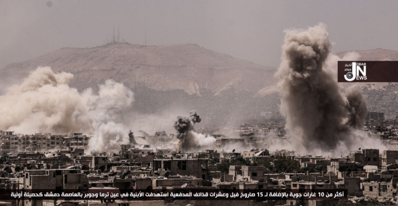 On Wednesday, Syrian Air Force warplanes carried out dozens of airstrikes against Faylaq al-Rahman positions in Jobar district, Ayn Tarma…