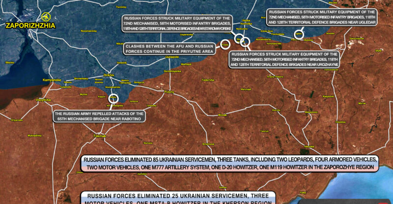 Russian strikes destroyed a command post near Novomikhailovka; Russian artillery struck AFU military equipment near Rabotino; Russian artillery struck AFU…