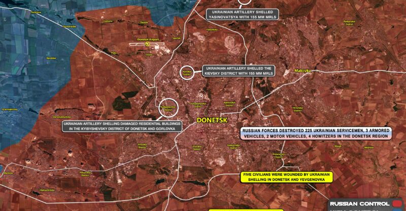 Ukrainian artillery shelled the Kievsky district with 155 mm MRLS; Ukrainian artillery shelled Yasinovatsya with 155 mm MRLS; Five civilians…