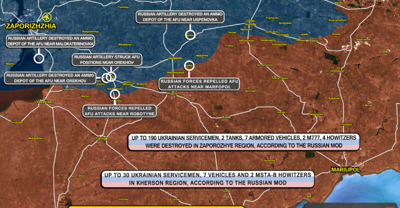 Russian artillery struck AFU positions near Orekhov; Russian artillery destroyed an ammo depot of the AFU near Uspenovka; Russian artillery…