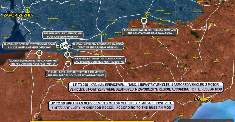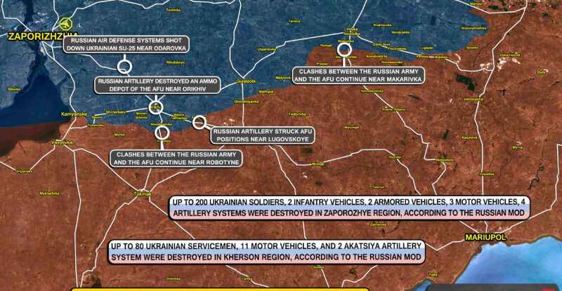 Russian artillery struck AFU positions near Orekhov; Russian air defense systems shot down a Su-25 warplane near Orekhov; Russian artillery…