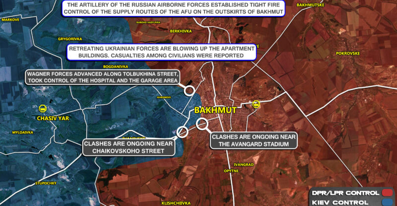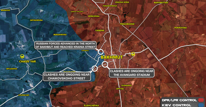 Russian forces advanced in the north of Bakhmut and reached Krainia street; Clashes are ongoing near the Avangard stadium; Clashes…