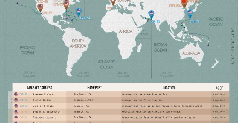 This map shows the approximate locations of US, British, French, Chinese and Russian aicraft carriers and carrier strike groups. SouthFront:…