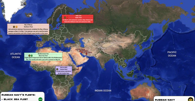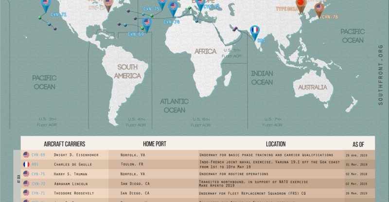 This map shows the approximate locations of US, British, French, Chinese and Russian aicraft carriers and carrier strike groups. SouthFront: Analysis…