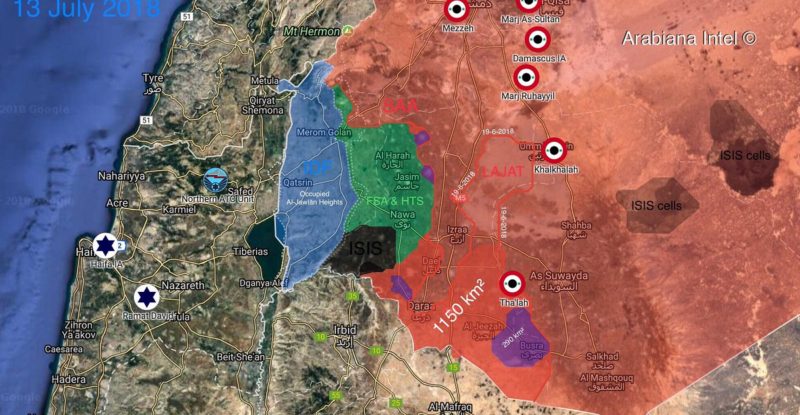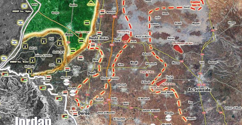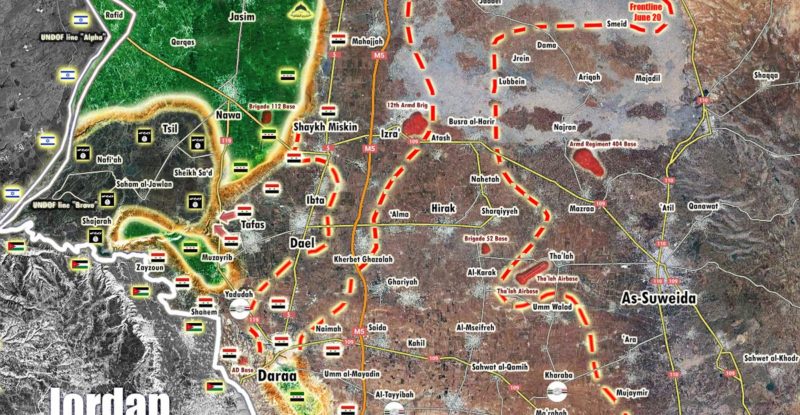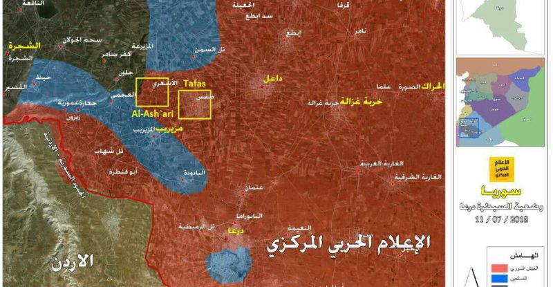 This map provides a general look at the military situation in the southern Syrian province of Daraa on July 12,…