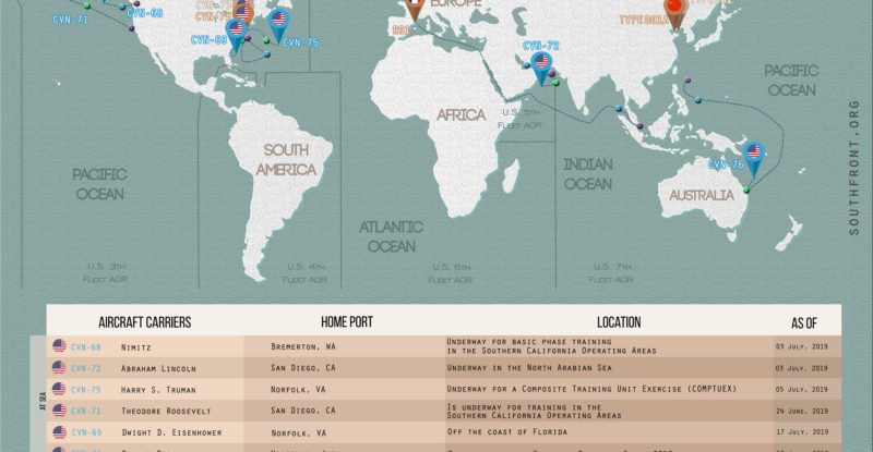This map shows the approximate locations of US, British, French, Chinese and Russian aicraft carriers and carrier strike groups. SouthFront:…