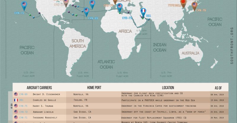 This map shows the approximate locations of US, British, French, Chinese and Russian aicraft carriers and carrier strike groups. SouthFront: Analysis…