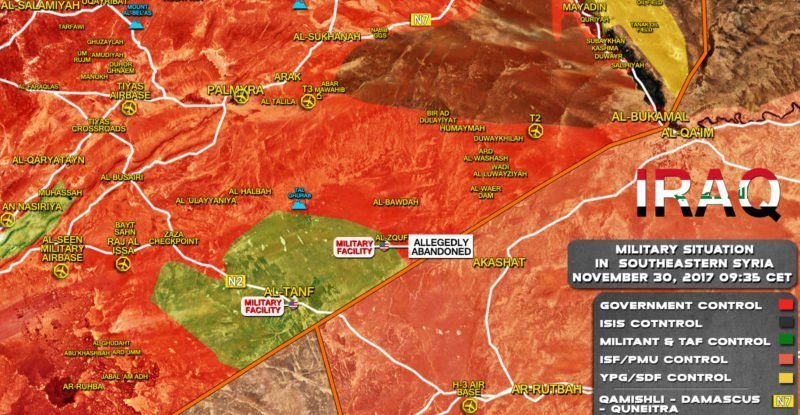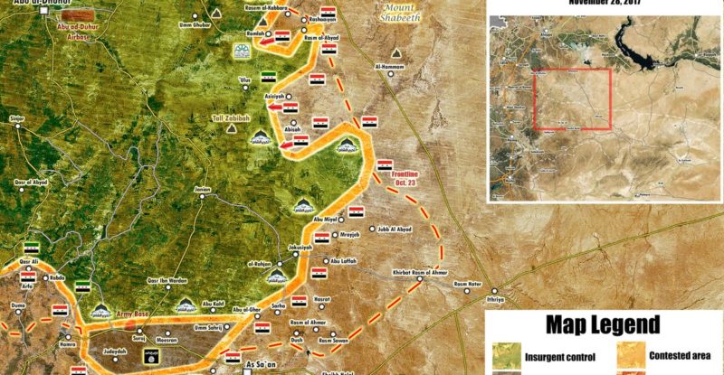 This map provides a general look at the military situation in southeastern Syria on November 30, 2017. The Syrian Arab…