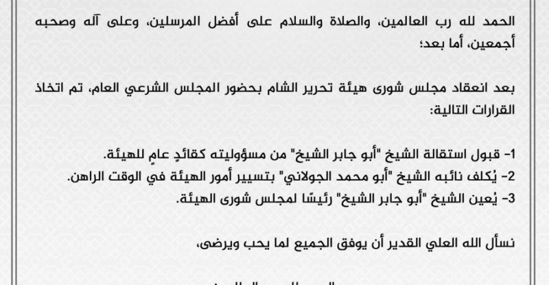 On October 1, Hay’at Tahrir al-Sham (HTS) announced in an official statement that its leader Abu Jaber Shaykh have resigned…
