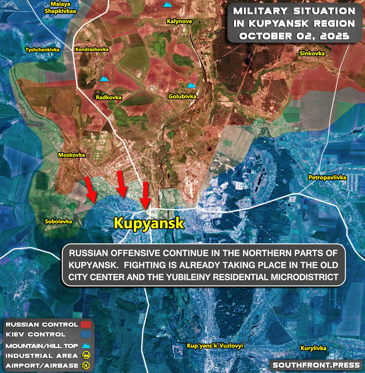By October 2, the Zapad [West] Group of Forces had reportedly reached the old center of Kupyansk. Intense fighting is said to be currently taking place in the clothing market, the Estakadny railway station, and the Yubileiny residential microdistrict.