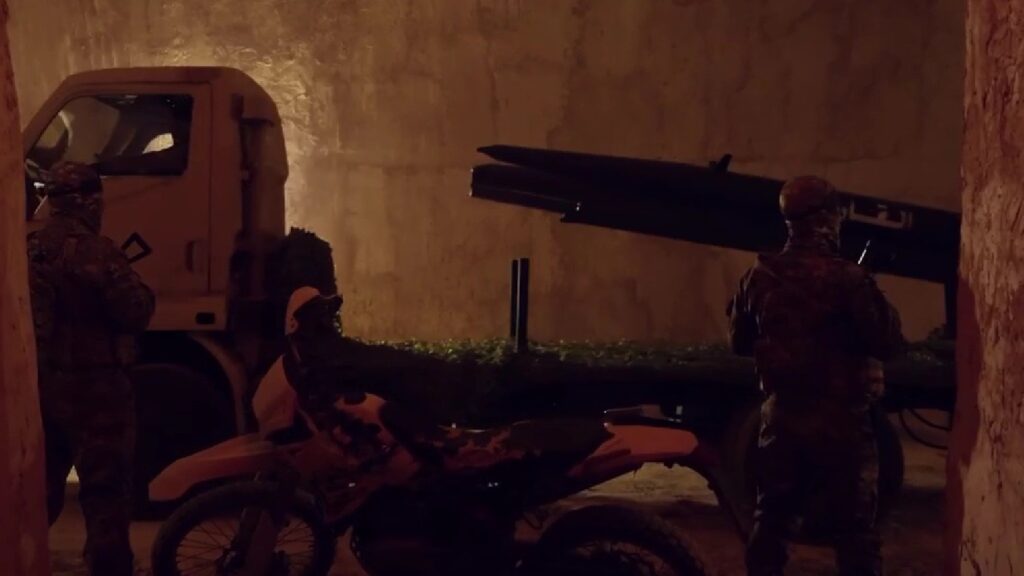 The footage shows several truck-mounted dual missile launchers moving inside the tunnel, which is decorated with a banner reading “Death To America, Death To Israel” in addition to the photos of several living and dead regional leaders of the so-called Axis of Resistance.