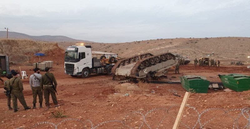 An Israeli Merkava battle tank flipped upside down while it was being loaded onto a truck during a drill in…