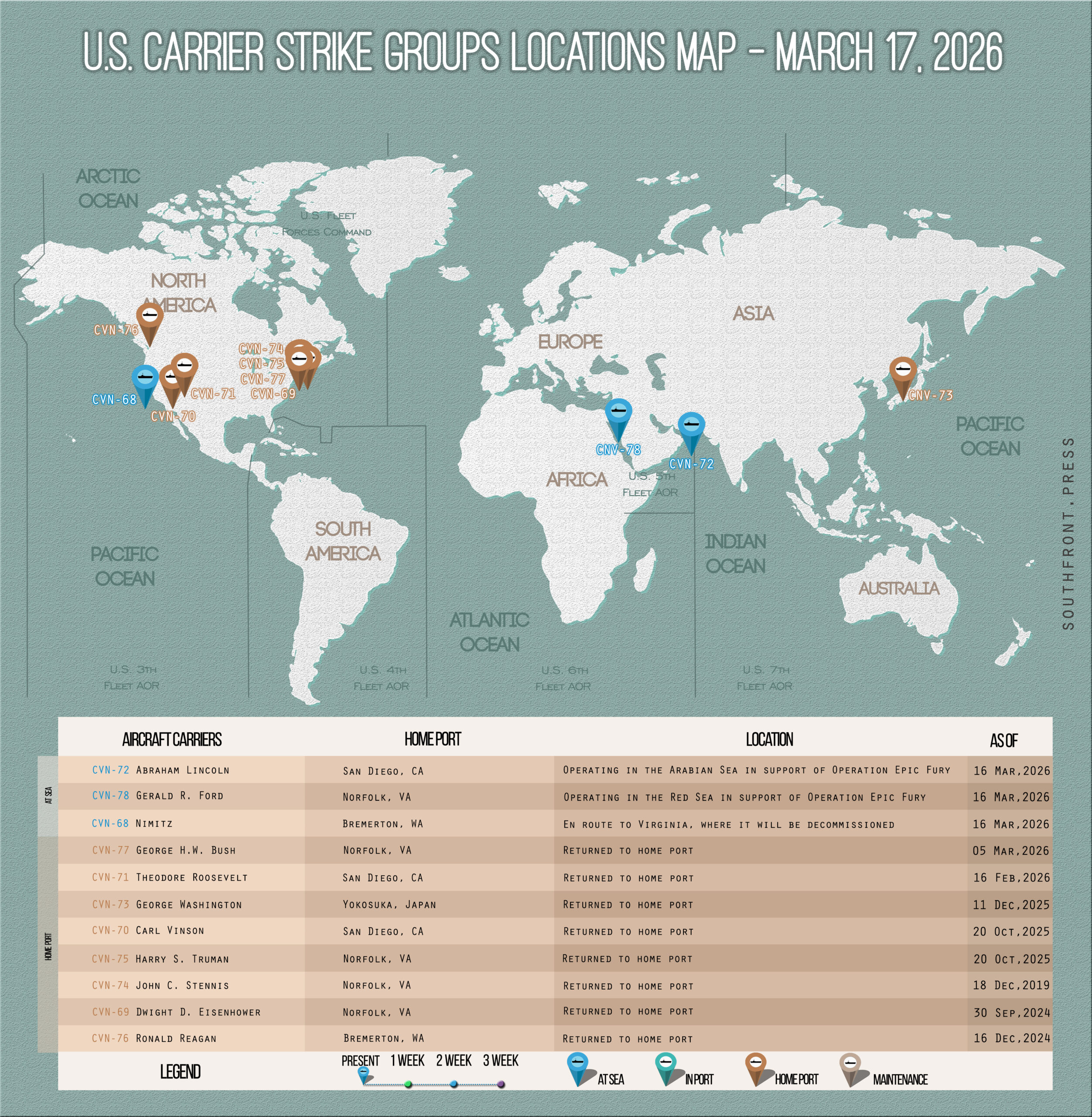 This is the newest update of the ‘U.S. Carrier Strike Groups Locations Map’ exclusive series showing the approximate locations of U.S. Carrier Strike Groups. SouthFront: Analysis & Intelligence tracks locations of U.S. aircraft carriers using the available open-source information. No classified information was used in production of the map.