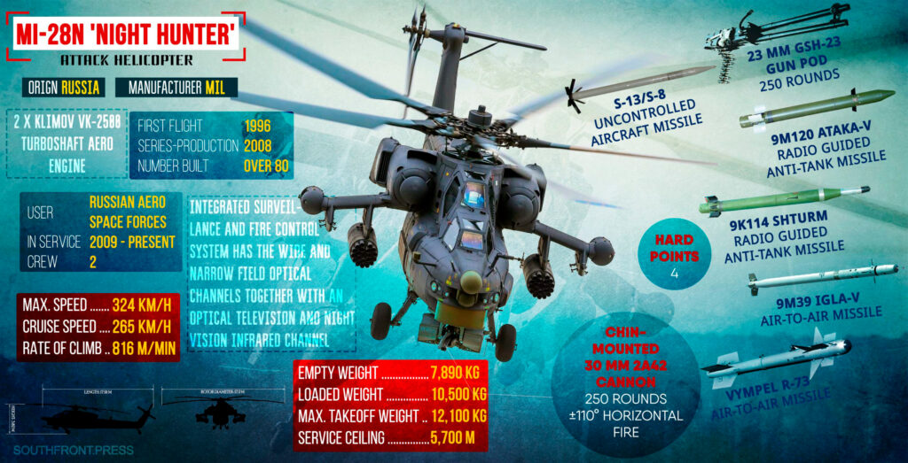 Armed with Igla-V and R-73 anti-aircraft missiles, in addition to its chin-mounted 30 mm gun, the Mi-28NE can be a lethal drone-hunter, especially with the inclusion of the N025NE, which is reported to have a detection range from 10 to 20 kilometers.