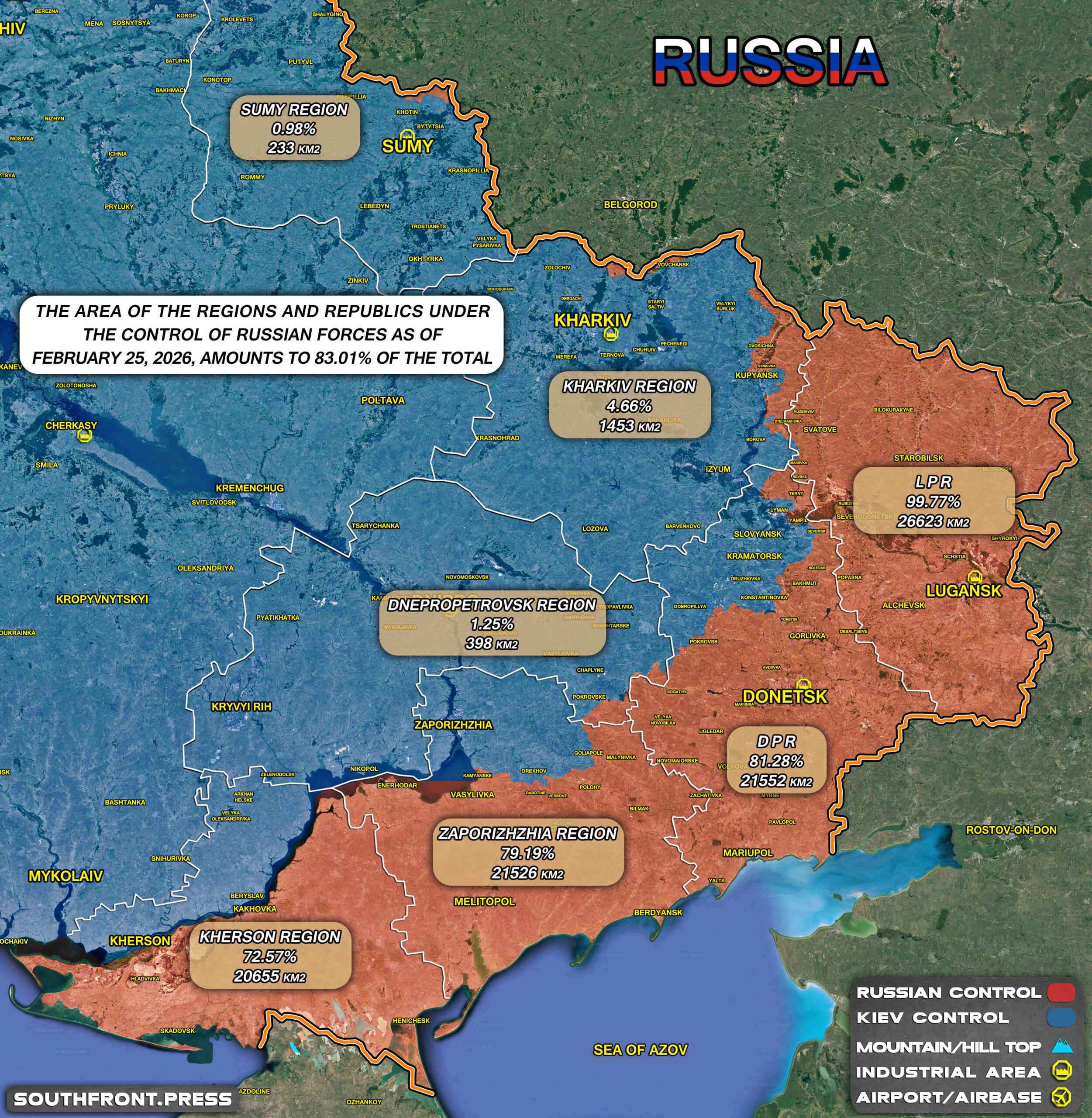 - The area of the regions and republics under the control of Russian forces as of February 25, 2026, amounts to 83.01% of the total: Kherson region — 72.57%, Zaporizhzhia region — 79.19%, DPR — 81.28%, LPR — 99.77%, Kharkiv region — 4.66%, Sumy region — 0.98%, and Dnipropetrovsk region — 1.25%.