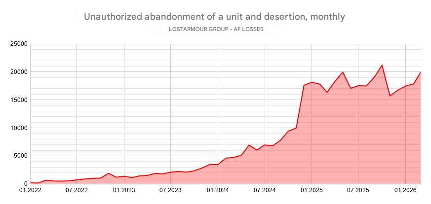 Open-source estimates indicate that, by April 1, 2026, the monthly number of deserters from the Ukrainian army had once again reached approximately 20,000. This indicates that at least 30,000 people are mobilized each month, approximately 60% of whom never reach frontline units. Most desertions occur from training camps or in areas far from the front. These stages are the least controlled precisely because all roads and communication routes in the frontline zone are monitored by checkpoints. Consequently, a deserter’s chance of returning home is slim to none; he may be shot on the spot or forcibly transferred to an assault unit, where the likelihood of dying is 90%.