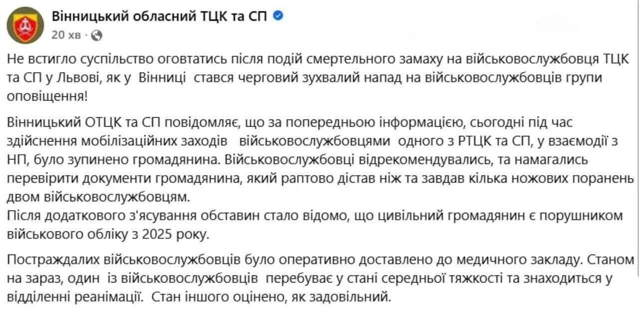 he Vinnytsia Regional Military Commissariat reports that two employees of the military registration and enlistment office were attacked by an unknown assailant. One of the employees was hospitalized in intensive care with a slit throat.