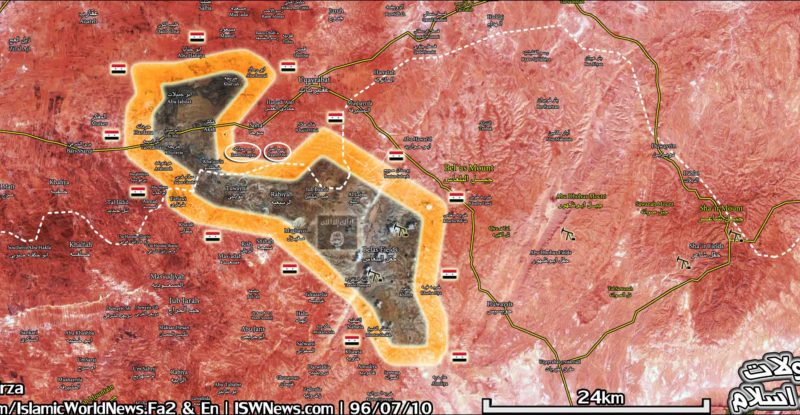 This map provides a general look at the military situation in the eastern Salamiyah pocket where government forces are pressuring…