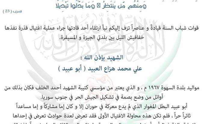 On September 7, Ali Mohamad al-Abed, a field commander of Shaba Al-Sunnah Forces – a Free Syrian Army (FSA) group…