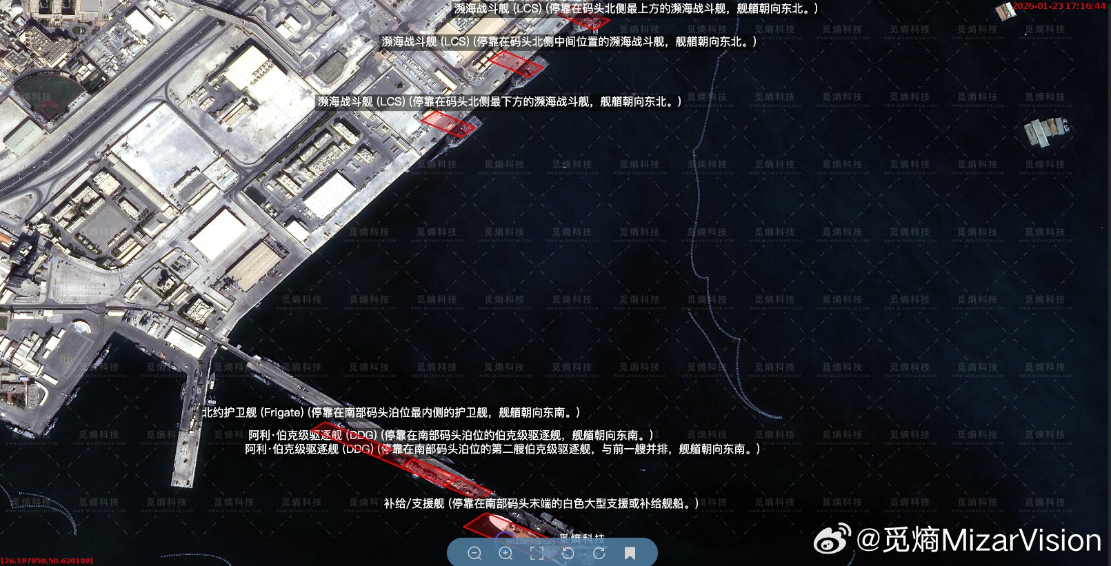 Fresh satellite images from China’s MizarVision also showed three littoral combat ships and two Arleigh Burke-class guided missile destroyers docked in Bahrain’s Salman Port. Many other warships, including at least one nuclear attack submarine, are believed to be in the region.